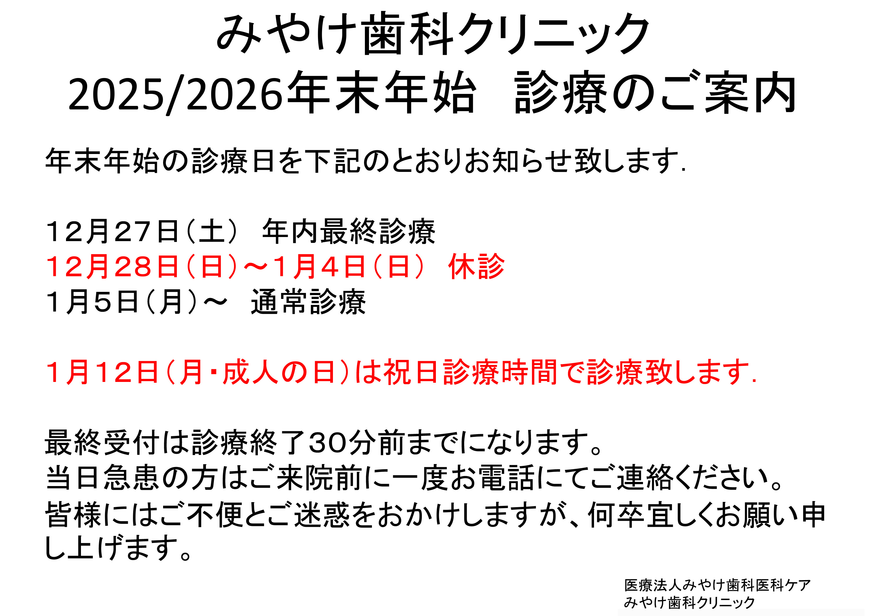 - 医療法人の特色を生かし,関連施設である『笹木野みやけ内科外科』と連携し,高齢者・有病者にも問題なく対応できる医院になっています.また,ご来院が困難な患者様のために訪問診療もおこなっております。